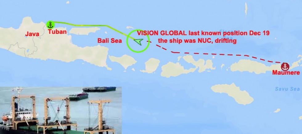 Genel kargo gemisi VISION GLOBAL, Endonezya'nın Bali adasının kuzeyindeki Bali denizinde 19 Aralık'tan bu yana battı veya batıyor. 13 mürettebatın can salında olduğu, 8'inin kayıp olduğu bildirildi. Gemi Java'nın kuzeyindeki Tuban limanından Flores adasındaki Maumere'ye doğru yol almaktaydı ve 20 Aralık'ta tehlike sinyali verdi. Gemi 18 Aralık sonundan beri seyir halinde değildi, sürükleniyordu, AIS 19 Aralık'tan beri kapalı, son AIS konumu tehlike koordinatlarıyla çakışıyor. Kurtarma gemisi 21 Aralık saat 1000 itibariyle bölgedeydi. Felaketin nedeni bilinmiyor.