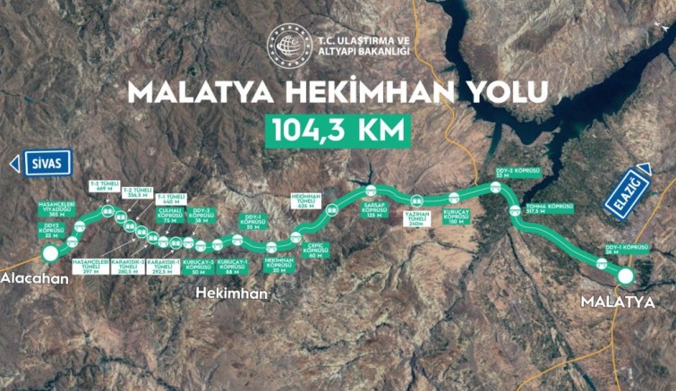Açıklamada, “Malatya’yı Sivas’a bağlayan kuzey–güney aksında tek yol olarak hizmet veren 108 km’lik mevcut Malatya-Hekimhan Yolu, 104,3 kilometre uzunluğunda yeniden projelendirildi. 2x2 şeritli, bitümlü sıcak karışım (BSK) kaplamalı bölünmüş yol haline getirildi. Engebeli arazi yapısında tesis edilen yol güzergahında toplam 6 bin 163 metre uzunluğunda 8 adet tünel, 2 bin 398 metre uzunluğunda 14 adet köprü inşa edildi” ifadeleri yer aldı.