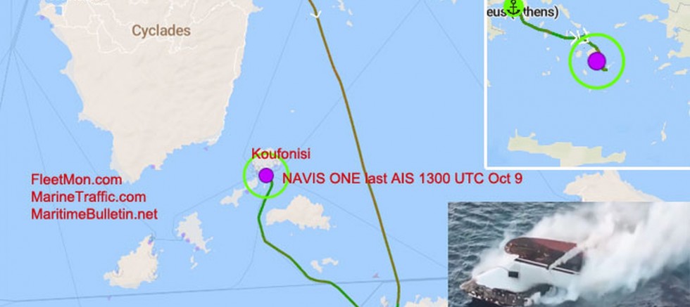 NAVIS ONE isimli motoryat 9 Ekim akşamı Yunanistan'ın Ege Denizi'ndeki Koufonisi Adası açıklarında 22 kişiyle birlikte alev almıştır. Misafir ve mürettebattan oluşan 22 kişinin tamamı tahliye edildi, hepsi güvende. 47 metrelik yat 10 Ekim sabahı yandı ve battı, Kiralık olduğu anlaşıldı.